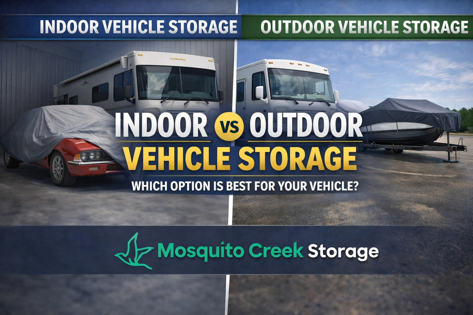## **Indoor vs Outdoor Vehicle Storage: Which Option Is Right for You?** When searching for **vehicle storage near me** in **Cortland, Warren, Champion, Vienna, and Bazetta Township, Ohio**, many people are unsure whether **indoor vehicle storage** or **outdoor vehicle storage** is the better choice. At **Mosquito Creek Storage**, we offer secure and convenient vehicle storage solutions designed to fit a wide range of needs, budgets, and vehicle types. Understanding the difference between indoor and outdoor storage can help you choose the best option for protecting your vehicle. ### **What Is Indoor Vehicle Storage?** **Indoor vehicle storage** means your vehicle is stored inside a fully enclosed storage unit or building. This option is ideal for customers searching for **secure storage near me** or **climate-protected vehicle storage**. #### **Benefits of Indoor Vehicle Storage** * Protection from weather such as rain, snow, hail, and sun * Added security and privacy * Reduced risk of rust, fading, and weather-related wear If you’re looking for **indoor car storage near me**, **vehicle storage near me**, or **secure storage near me**, indoor storage provides the highest level of protection and peace of mind. ### **What Is Outdoor Vehicle Storage?** **Outdoor vehicle storage** offers designated parking spaces within a secure, fenced storage facility. This option is popular for customers looking for **affordable vehicle storage near me**. #### **Benefits of Outdoor Vehicle Storage** * Cost-effective storage solution * Easy access for larger vehicles * Secure gated access and video surveillance Outdoor storage is perfect for customers searching for **RV storage near me**, **boat storage near me**, or **trailer storage near me** who want convenient access without the higher cost of indoor storage. ### **Indoor vs Outdoor Vehicle Storage: Key Differences** | Feature | Indoor Vehicle Storage | Outdoor Vehicle Storage | | ------------------ | ---------------------- | ----------------------- | | Weather Protection | Full protection | Exposure to elements | | Security Level | Highest | High | | Cost | Higher | More affordable | ### **Which Vehicle Storage Option Should You Choose?** Choosing between **indoor vs outdoor vehicle storage** depends on: * The type of vehicle you own * How often you need access * Your budget * Length of storage time If your priority is maximum protection, **indoor storage near me** is the best option. If you want affordable, accessible storage for a larger vehicle, **outdoor vehicle storage near me** may be the right choice. ### **Why Choose Mosquito Creek Storage?** At **Mosquito Creek Storage**, proudly serving **Cortland, Warren, Champion, Vienna, Bazetta Township, and surrounding Northeast Ohio communities**, we are proud to offer: * **Secure vehicle storage near me** * Indoor and outdoor vehicle storage options * Gated access and video surveillance * Convenient locations in Northeast Ohio * Easy online rentals and payments * Clean, well-maintained storage facilities Whether you need **car storage**, **RV storage**, **boat storage**, or **long-term vehicle storage near me**, we have a solution that fits your needs. ### **Find Vehicle Storage Near You Today** If you’re searching for **storage near me**, **vehicle storage near me**, or **secure storage near me** in **Cortland, Warren, Champion, Vienna, or Bazetta Township**, contact **Mosquito Creek Storage** today. Our team is ready to help you find the perfect indoor or outdoor storage option for your vehicle. 👉 **Rent online 24/7 and reserve your vehicle storage near you today!**